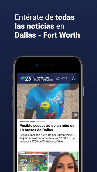 ยูนิวิชัน 23 แดลลัสเป็นพอร์ทัลข่าวฟรีที่เน้นให้บริการแก่ชุมชนที่พูดภาษาสเปนในสหรัฐฯ แอปพลิเคชันนี้ให้ข่าวที่อัปเดตล่าสุดเกี่ยวกับการอพยพ การเลือกตั้งปี 2020 การเมือง ผลลอตเตอรี่เท็กซัส ข้อมูลสภาพอากาศ การเงิน การศึกษา สุขภาพ สิ่งแวดล้อม พายุเขตร้อน พายุทอร์นาโด พายุฮัริเคน ประธานาธิบดีสหรัฐ โดนัลด์ ทรัมป์ การเนรเทศ และอื่นๆ แอปพลิเคชันนี้มีการออกแบบการนำทางใหม่และน่าสนใจซึ่งช่วยให้คุณสามารถรับชมการออกอากาศสด วิดีโอตามคำขอ และรับการแจ้งเตือนข่าวสารเด่น คุณยังสามารถฟังสถานีวิทยุที่คุณชื่นชอบและตรวจสอบผลลอตเตอรี่เท็กซัสล่าสุดได้